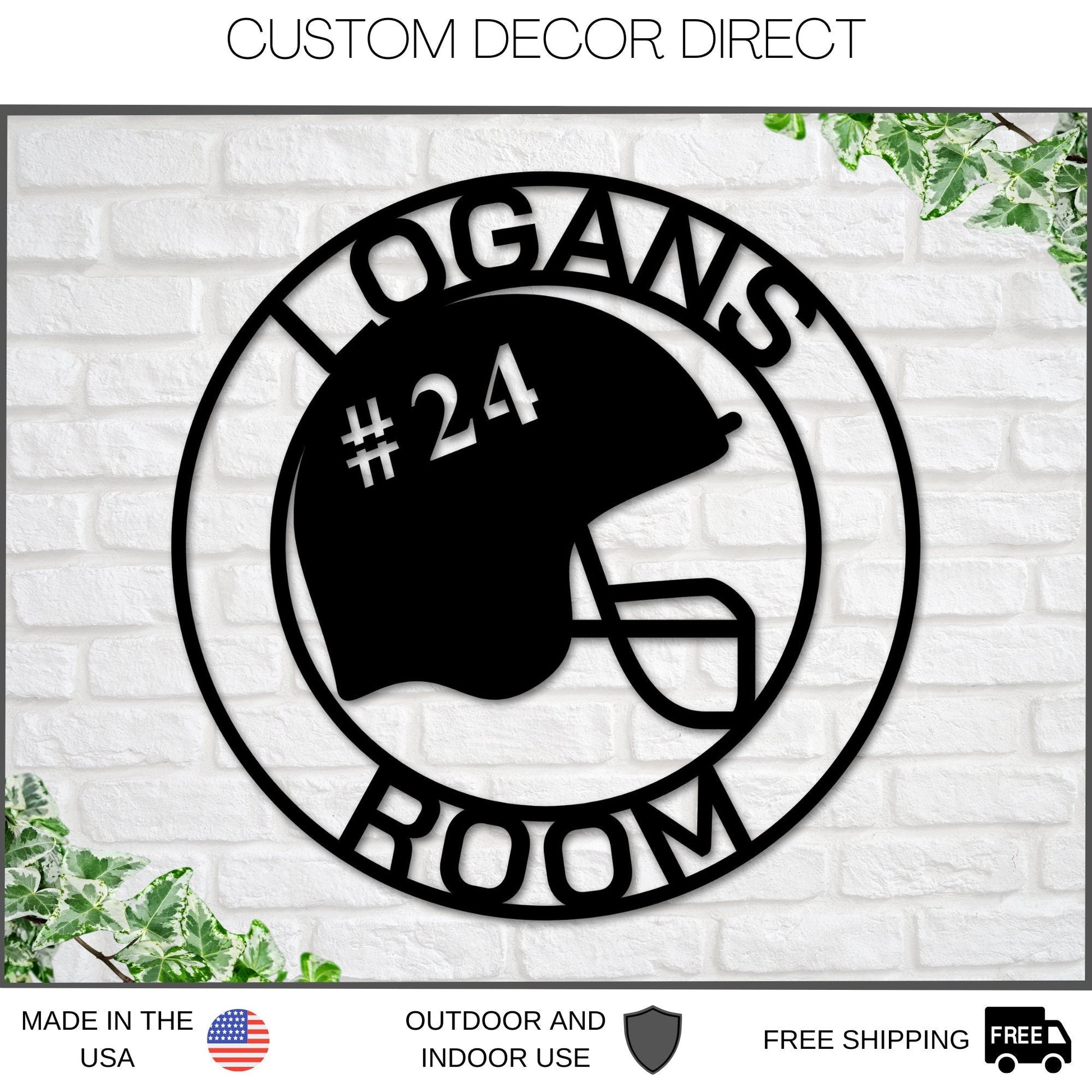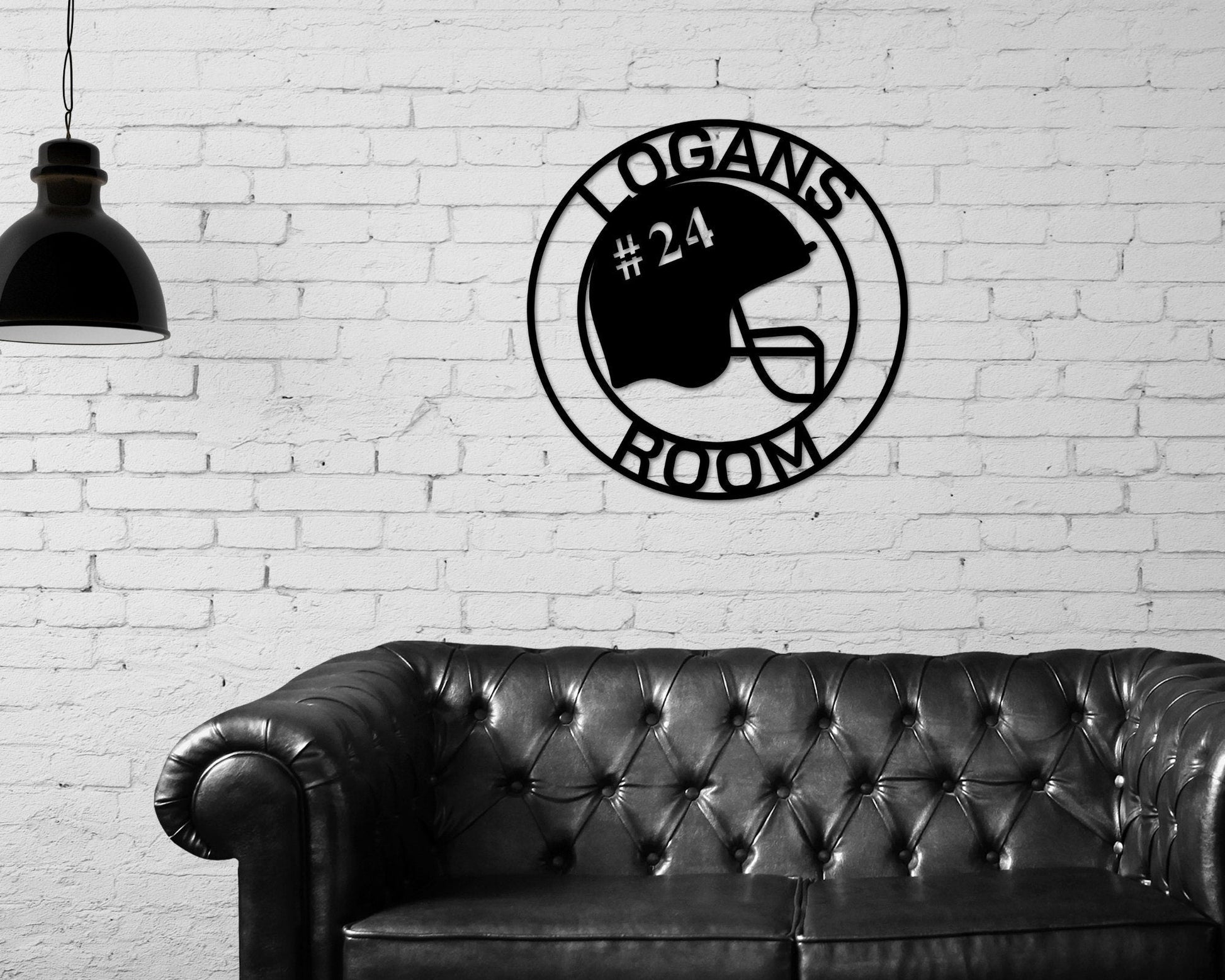 Are you a football fan? This personalized helmet and number sign is a perfect gift for a football coach, player or fan! This unique sports decor will be the hit of any man cave, garage, sports room, bedroom, bar, or game room and makes a great gift for Father's Day, birthdays, graduations, Christmas or any special occasion. This football helmet and number sign is custom made just for you. Please enter your personalized text in the box above. This sign is handmade from heavy duty 18 gauge steel. Each piece is designed, cut, welded, prepped, painted and powder coated by hand. This sign is designed for both indoors and outdoors, but will rust if left outdoors unprotected. It comes with a pre-drilled hole if requested for easy hanging. Please note that this sign is not a toy and should be kept out of reach of children. Please enter your text in the box above exactly as you would like it to appear on your sign. When entering your personalization please put exactly what you would like your sign to say. If you want your sign to look exactly like the listing photo, please re enter the personalization. *Please note our decor does not include hanging hardware. All of our decor sizing is calculated to the longest side (height/width) of the sign. Crafted from laser-cut from premium 18 gauge steel, and powder coated for long-lasting protection. Sign is easy to hang with normal nails or screws, you can even use magnets to get a seamless look! (Request Hanging Holes if needed) You can choose from various colors to create a sign that suits your style and personality This custom sign is available in 5 different colors: black, white, red, silver, and copper Signs are available in 6 different sizes: 12 inches, 14 inches, 18 inches, 24 inches, 30 inches, and 36 inches.